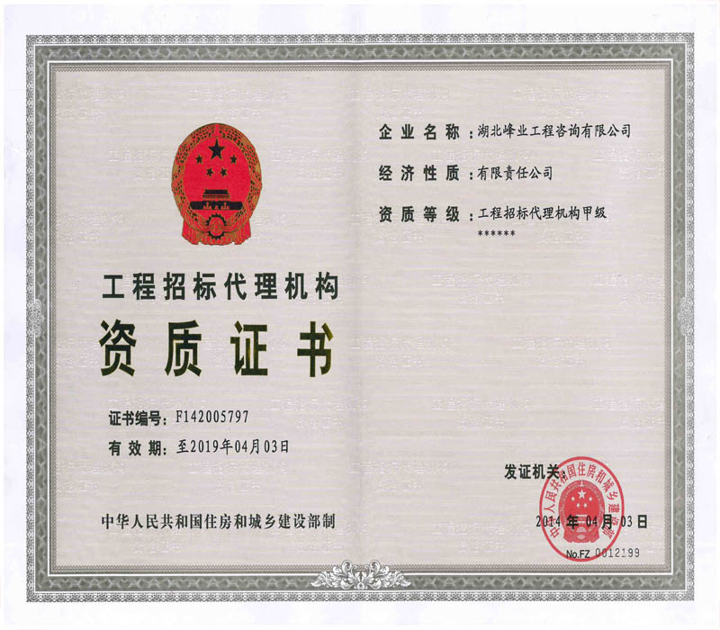• 工程招標代理甲級資格證書